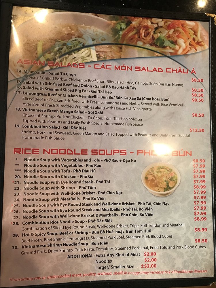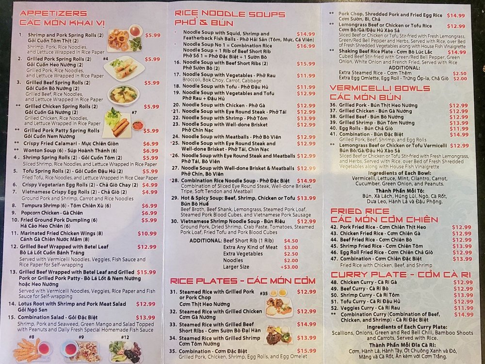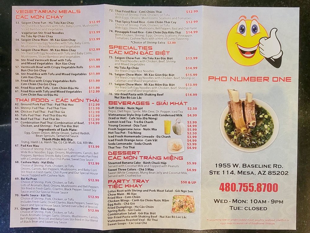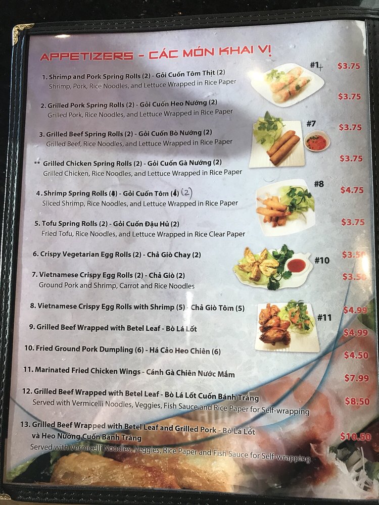 Introducing the menu at Pho Number One, located in Mesa, AZ, this Vietnamese restaurant offers a variety of dishes perfect for lunch or dinner. From appetizers like Shrimp and Pork Spring Rolls to Asian Salads and Rice Noodle Soups, there are plenty of delicious options to choose from. Customers have raved about the flavors and quality of the food, with favorites including the Combination Pho and Grilled Beef Wrapped with Betel Leaf. The welcoming atmosphere and efficient service make dining here a pleasant experience. Don't miss out on trying the Coconut Drink, a unique and refreshing beverage option. Overall, Pho Number One stands out for its authentic Vietnamese cuisine and excellent customer reviews, making it a must-visit for food enthusiasts in the area.